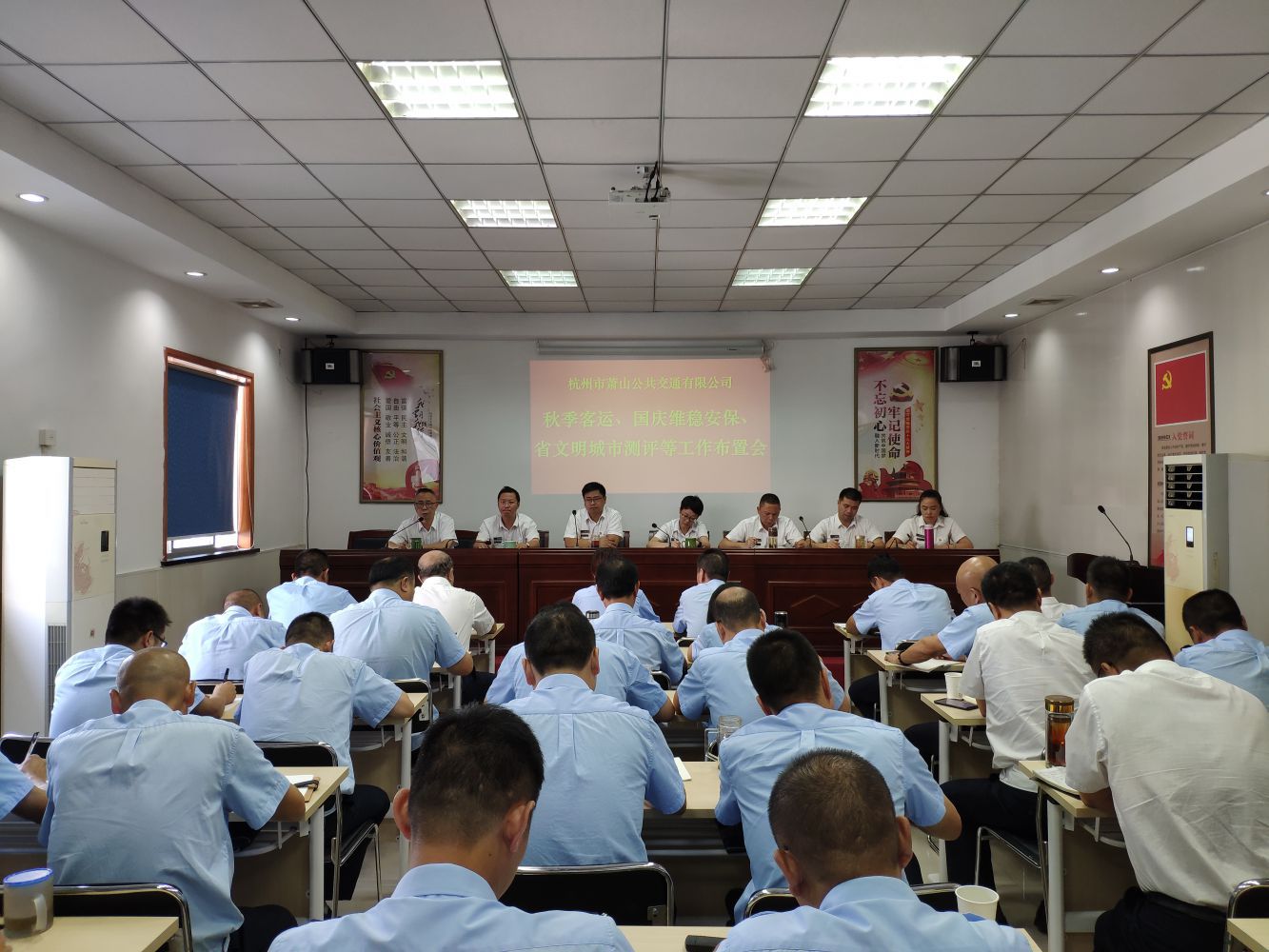 2019年9月20日,蕭山公交公司在一樓會議室召開近期重點工作布置會,傳達集團會議精神,部署秋季客運、國慶安保維穩、省文明城市測評等近期重點工作,進一步明確各項工作目標要求。公司全體班子成員、全體中層參加會議。會議由張國棟總經理主持。