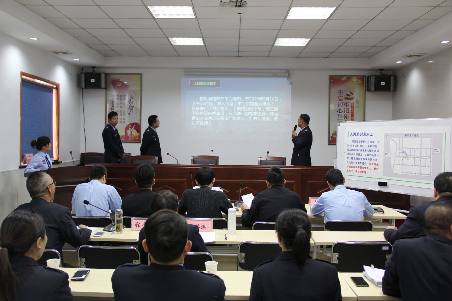 本次比武中,七支參賽隊伍采用新聞發布會的形式,圍繞“人民路部分路段半封閉施工后公交繞行方案”的命題內容進行相關計劃模擬新聞發布;各參賽隊隊員合作默契,思路清晰,以縝密的分析和準確的敘述,將平日積累的優秀營運管理技能充分展現出來。為體現比賽的公正、公平,公司還特邀市北交警中隊副中隊長王俊杰、區道路運輸管理處辦公室主任戚波波、區交通運輸局運管科汪峰、公司董事長、總經理張國棟等班子以及相關部門負責人組成評委組,對七支參賽隊進行現場提問和打分。經過三個小時的激烈角逐,最終三車隊、六車隊、四車隊分別獲得本次演示比武的第一名、第二名及第三名。