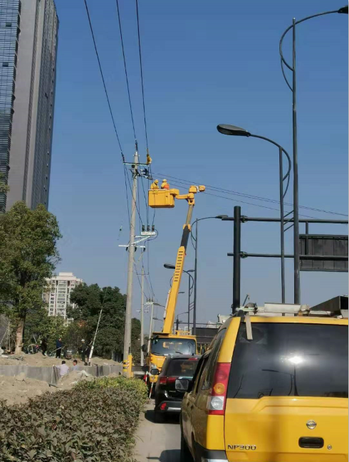 12月11日上午9時,經(jīng)我司前期征遷部的不懈的協(xié)調(diào)工作后,由蕭山電力局、蕭山湘湖電力營業(yè)所及浙江中新電力建設(shè)有限公司帶隊對時代大道改建工程湘師路以北10KV東汪C271線43號桿~44號桿架空線上改下進行帶電作業(yè)。由于時代大道車流量大和兩側(cè)施工作業(yè)面小雙重原因,導(dǎo)致電力施工難度徒增。經(jīng)電力施工人員克服重重困難后,于中午11時完成帶電割接工作,并在第二合同段的配合下完成了剪線工作。于下午14時左右,該線路完成全部遷改工作。該線路遷改的完成成功掃清了151#號樁和152#號樁之間的架梁工作障礙,有效保證了下階段工程的施工進度。