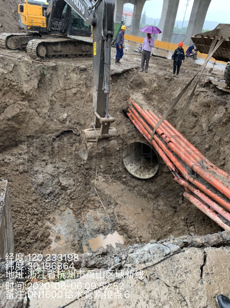 面對如此復(fù)雜困難的局面,如何在高架工程總體進度按計劃有序推進的前提下,又要保證管道能盡快完成遷改,擺在了建管公司征遷部工作人員的面前。建管員工充分發(fā)揚“干”字當(dāng)頭,征遷部積極牽頭各相關(guān)部門和公司其它部門科室,通過不斷地現(xiàn)場踏看和實地摸底排查、對各方的施工時序予以協(xié)調(diào)、組織相關(guān)的管線產(chǎn)權(quán)單位到現(xiàn)場進行交底,密切聯(lián)系沿線鎮(zhèn)街協(xié)調(diào)前期政策處理,根據(jù)現(xiàn)場實際確定了最佳管道遷改路徑。解決了路面交通情況復(fù)雜、施工作業(yè)面受限,將各方的交叉施工對管道遷改推進影響降低到最小。如這次割接的DN1600給水管位置均在現(xiàn)狀交改保通車道上,新舊管連接時必需組織交通導(dǎo)改。建管公司會同環(huán)境投資公司提早謀劃,緊密配合,積極主動地與交警等相關(guān)職能部門對接,通過多次協(xié)調(diào)和評審,按時完成涉路交改相關(guān)行政審批。在與環(huán)境集團一起進行了充足的準(zhǔn)備工作之后,本次DN1600給水管割接戰(zhàn)正式拉開帷幕。暴雨一波接一波,天公的不作美給遷改工作帶來了更大的壓力,建管公司前期部相關(guān)人員會同供水公司、投資公司的相關(guān)領(lǐng)導(dǎo)現(xiàn)場協(xié)調(diào)、緊盯節(jié)點,全力以赴打下了本次割接戰(zhàn)。