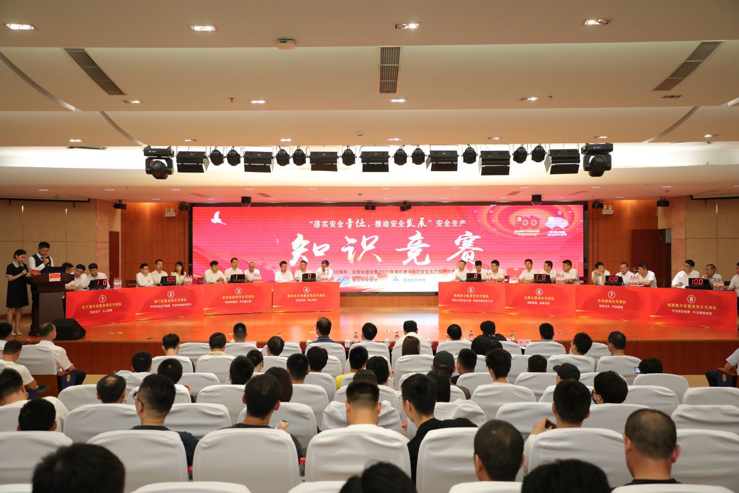 本次競(jìng)賽分為個(gè)人必答題、搶答題、簡答題和附加題四種競(jìng)賽形式,內(nèi)容涵蓋了安全生產(chǎn)相關(guān)法律法規(guī)、安全管理、消防知識(shí)等。由公司員工代表及各參建單位組成的8支代表隊(duì)登臺(tái)參賽,各參賽代表隊(duì)朝氣蓬勃、斗志昂揚(yáng),參賽選手精神飽滿、沉著應(yīng)答。
