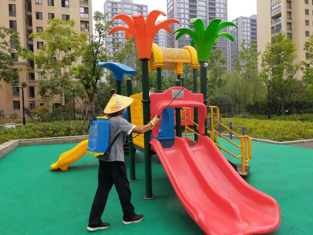 目前疫情形勢嚴峻,消殺工作非常重要,確保物業服務人員做好自身防疫工作的同時,組織保潔不定時對小區公共區域進行消毒,做到垃圾日產日清,對垃圾桶及時清洗消毒。在單元大廳、地庫出入口、電梯轎廂等公共區域增加消殺頻次,同時加強園區主干道路、公共設施區域的消殺,切斷感染源。