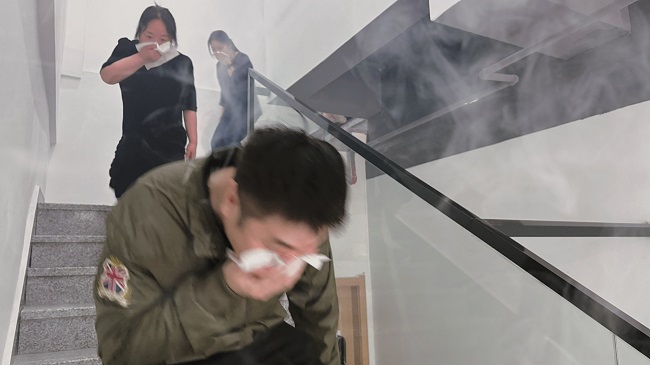 隨后開展的應(yīng)急逃生演練模擬辦公區(qū)突發(fā)火情場(chǎng)景。煙霧彌漫后,全體職工迅速用濕毛巾捂住口鼻,彎腰低姿沿安全通道有序撤離,達(dá)到“快速反應(yīng)、科學(xué)逃生”的預(yù)期目標(biāo)。